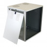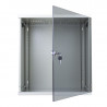 Não ocupa área útil, visto que é instalado na parede. Possui plano de fixação com furação para porca gaiola a cada 1/2U e com possibilidade de regulagem na profundidade. Furação para entrada de cabos no teto e na base (103 x 57 mm) e para sistema duplo ventilação. Fechamento com porta de vidro, possibilitando total visão frontal dos equipamentos. Tampa lateral facilmente removível através de fechos rápidos.